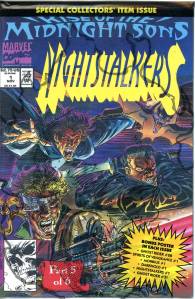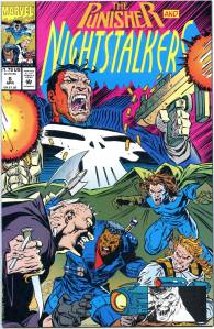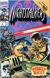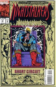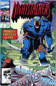 Nightstalkers, published by Marvel Comics from 1992 to 1994, featured a trio of occult experts reluctantly banded together to fight supernatural threats. Operating under the business name Borderline Investigations, the team was composed of the vampire–hunters Blade and Frank Drake, who had fought Count Dracula in the 1970s series The Tomb of Dracula; and private detective Hannibal King, also introduced in that previous series, a “neo-vampire” with vampiric abilities but only a craving, not a need, for drinking blood. They are gathered by Doctor Strange in Nightstalkers #1 (Nov. 1992) to battle an immediate threat, but under Strange’s larger, hidden agenda.