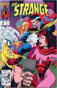 Doctor Strange: Sorcerer Supreme, ran 90 issues (November 1988 – June 1996). The initial creative team was writer Peter B. Gillis and artists Richard Case and Randy Emberlin, with storylines often spanning multiple issues. Strange lost the title of “Sorcerer Supreme” in issues #48-49 (Dec. 1992 – Jan. 1993) when he refused to fight a war on behalf of the Vishanti, the mystical entities that empower his spells. During this time the series became part of the “Midnight Sons” group of Marvel’s supernatural comics. Doctor Strange found new sources of magical strength in the form of chaos magic, as well as a magic construct he used as a proxy. He would form the Secret Defenders with a rotating roster of heroes, and reunite with the original Defenders. Strange regained his title in Doctor Strange: Sorcerer Supreme #80 (August 1995).