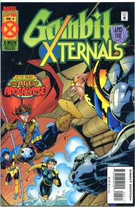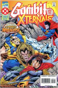 Gambit‘s X-Ternals consist of Sunspot, Jubilee, Strong Guy, and Lila Cheney. They are sent deep into space using Lila’s teleportation in order to retrieve a shard of the M’Kraan Crystal, essential to the verification of Bishop’s alternate reality. The X-Ternals are pursued by Rictor, a henchman of Apocalypse desperate to earn his master’s praise by killing Gambit. Upon reaching Shi’ar space, the X-ternals fight the Imperial Guard in order to retrieve the crystal shard. Upon their return to Earth, Strong Guy betrays the team, not only stealing the M’Kraan Crystal, but also kidnapping Magneto’s son, Charles. This title replaced X-Force.