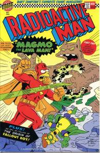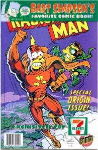 Radioactive Man was one of the four “premiere” series released by Bongo Comics in late 1993. The series has been released in two volumes, an early run from 1993–1994, and the current run that’s been going on since 2000. Smaller Radioactive Man stories have also been published in Simpsons Comics. As a tie-in promotion of The Simpsons Movie a special “Radioactive Man Comic Book Edition #711” was sold at 7-Elevens as part of their Kwik-E-Mart promotion.