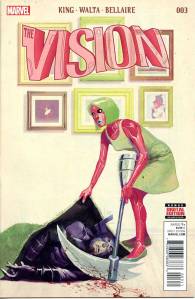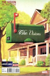 In 2016 Vision was given a solo series. He lives in Fairfax, Virginia with a synthazoid family: his wife Virginia, son Vin, and daughter Viv. They attempt to live a normal suburban life with Vision working as a consultant to the president, but they find a difficult time socializing with neighbors. Eventually Grim Reaper attacks their house and nearly kills Viv. Virginia claims that the Reaper escaped, but The Vision eventually finds his remains buried in the back yard. He lies to the police and covers for her when asked about her whereabouts during the murder of neighbors, who tried to blackmail Virginia for the murder, but was accidentally killed by her. Instead of confronting her, he creates a sythezoid dog for the family, in an attempt to return to normalcy, but unbeknownst to him Agatha Harkness has a vision of the future and tries to warn the Avengers that The Vision and his family will cause a genocide.