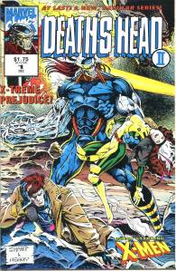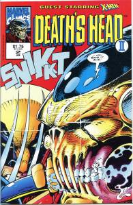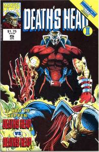 Originally launched as a four-issue limited series, Death’s Head II then became an ongoing series – and also featured in a number of team-up limited series designed to showcase new Marvel UK characters. One of these was Death3, teaming up Death’s Head II with newly created “brothers”, Death Metal and his prototype Death Wreck. The recurring character throughout this was Dr Evelyn Necker, the scientist who creates the Minion series (Death’s Head II and his “brothers”). Death’s Head II became the flagship character for Marvel UK – a costume was even made for promotional appearances and was part of the 1993 Lord Mayor’s Show – and there were concerns at Marvel UK in early 1993 that they could be overestimating his popularity and over-exposing the character. When Marvel UK was cancelled, a Death’s Head II/Punisher crossover was in production and he was playing a key role in the completed, but never published, Loose Cannons (released online).