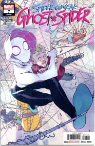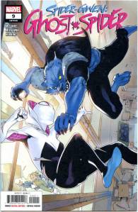 Realizing her secret identity is intact in this dimension, Gwen decides to attend college peacefully on Earth-616 without worrying about villains attacking. With Peter’s help, she enrolls in Empire State University, explaining to school admissions that she comes from another dimension. This, along with her test records and Parker vouching for her, earns Gwen enrollment and a scholarship that applies to visitors from other worlds and dimensions. Gwen begins regularly attending classes while “commuting” back and forth from her own Earth, regularly encountering Peter. In costume, she fights menaces on both worlds, including Miles Warren, whose unhealthy obsession with the Earth-616 Gwen Stacy led to his becoming the villainous Jackal.