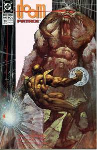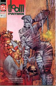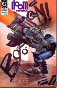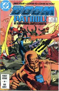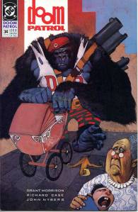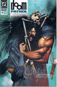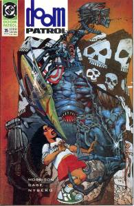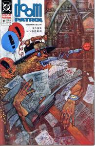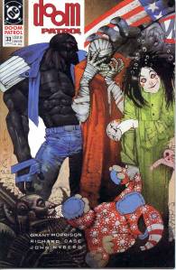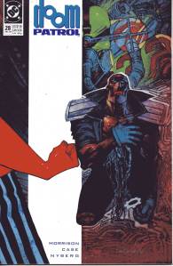 After the first 18 issues (and various crossovers and annuals), Kupperberg was replaced by Grant Morrison, starting with issue #19. Kupperberg agreed to help Morrison by writing out characters Morrison did not want to use: Celsius and Scott Fischer died before issue #18—Celsius was killed in an explosion in DC Comics’ “Invasion!” event, and Scott Fischer (already suffering from a recurrence of childhood leukemia) was the only known active superhero casualty of the Dominators‘ gene-bomb (also in “Invasion!”); Karma had left the team as he was still on the run from the law (he became a member of the Suicide Squad and died on his first mission with them in the “War of the Gods” crossover event); the Negative Spirit left Negative Woman’s body; and Lodestone plunged into a coma, where she would remain for the first half of Morrison’s run on the book. Tempest gave up fieldwork to become the team’s physician. Conversely, Morrison picked up a throw-away character from DP #14, who was slipped into the art on the last page of #18 to set up Morrison’s use: Dorothy Spinner is an ape-faced girl with powerful “imaginary friends.” Morrison also substantially retooled Negative Man: Larry Trainor (revealed to be alive in the Kupperburg run, as a prisoner of an underground society but now powerless) is forcibly merged with the Negative Spirit (now a cosmic entity) and a black doctor named Dr. Eleanor Poole, to create a transgender transracial gestalt entity known as Rebis. The new writer introduced some new characters to the team, including the multiple personality-afflicted Crazy Jane; and sentient roadway Danny the Street.