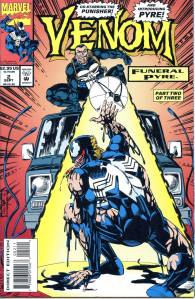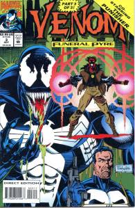 Writen by Carl Potss, Penciled by Tom Lyle and Inked by Scott Hanna, Al Milgrom and Joe Rubinstein, Venom: Funeral Pyre was a three-part series published between August and October 1993. The story continued Brock’s adventures in San Francisco, dealing with street gangs in an uneasy alliance with the Punisher, and saw the creation of the villain Pyre.