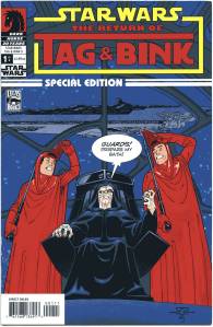 In the April 2006 comic, Tag and Bink are shown as children, haplessly trying to become Jedi under Master Yoda‘s tutelage. They find Anakin Skywalker and Padmé Amidala in a restaurant, as seen in Episode II – Attack of the Clones, and later secretly give tips to Anakin on how to romance Padmé. Anakin eventually leaves Tag and Bink stranded on Naboo when he goes to Tatooine. It takes them three years (the length of the Clone Wars) to get back to the Jedi Temple, just in time to see clone troopers destroy the Jedi Order. They are confronted by Anakin, newly rechristened Darth Vader; he spares them due to their past association but warns them to abandon their Jedi training.