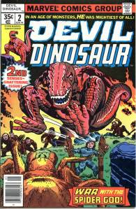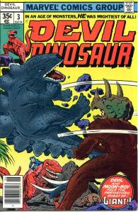 Devil Dinosaur and Moon-Boy are the creations of artist Jack Kirby who scripted and penciled all nine issues of the first series. Devil Dinosaur was created during Kirby’s third stint at Marvel (1975–1978). Having learned that DC Comics was working on an animated series featuring Kirby’s Kamandi, Marvel attempted to one-up their competitor by instructing Kirby to create a series similar to Kamandi, but incorporating a dinosaur co-star, since dinosaurs were hugely popular with young audiences of the time. The resulting Devil Dinosaur series was short lived, lasting only nine months (April – December 1978), and the proposed animated series never entered development. The original Devil Dinosaur series chronicled Devil and Moon-Boy’s adventures in their home, “Dinosaur World”. After the cancellation of Devil Dinosaur, the character’s appearances were relegated to one-shot comics, cameos, and supporting roles in other series.