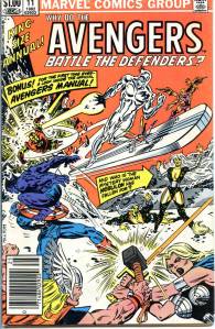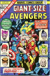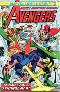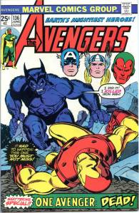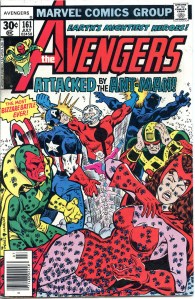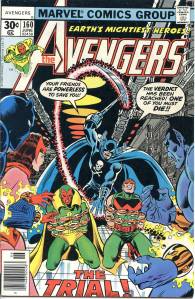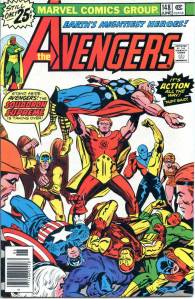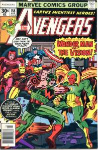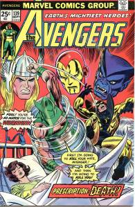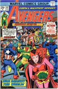 During the summer of 1973, Englehart and artists Bob Brown and Sal Buscema produced “The Avengers-Defenders Clash” storyline which crossed over between the two team titles. “The Celestial Madonna” arc linked Mantis’ origins to the very beginnings of the Kree-Skrull conflict in a time-spanning adventure involving Kang the Conqueror, and Immortus, who were past and future versions of each other. Mantis was revealed to be the Celestial Madonna, who was destined to give birth to a being that would save the universe. It was revealed that the Vision’s body had only been appropriated, and not created by Ultron, and that it originally belonged to the 1940s Human Torch. With his origins clear to him, the Vision proposed to the Scarlet Witch. The “Celestial Madonna” saga ended with their wedding, presided over by Immortus. The Beast and Moondragon joined the team soon after. George Pérez became the title’s artist with issue #141 (Nov. 1975) which saw the start of a seven-part story featuring the Squadron Supreme and the Serpent Crown. In 2010, Comics Bulletin ranked Englehart’s run on The Avengers eighth on its list of the “Top 10 1970s Marvels”.