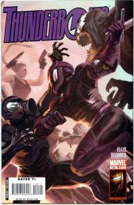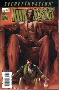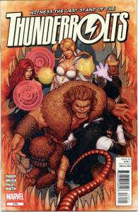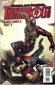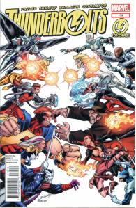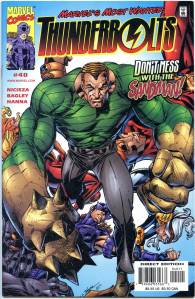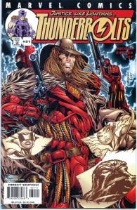 Soon after the publication of The Incredible Hulk #449, the team’s own series premiered. The first issue, cover dated April 1997, was played largely as a straight superhero story, until the revelation of the Thunderbolts’ true nature on the last page of the comic. This is considered one of the most well-conceived plot twists in the history of American comic books, with Wizard magazine readers voting it “Comics’ Greatest Moment of 1997” and later, in 1999, placing it at #11 on a list of “The 25 Greatest Comic Moments Ever”. Marvel managed to keep the secret of the Thunderbolts’ true villainous identities tightly under wraps before the book launched. When word got out, the first issue sold out so quickly that Marvel not only offered a second printing, but also did a “mini-trade paperback” collecting the first two issues. Fabian Nicieza replaced Busiek in issue #34. Patrick Zircher, after a couple of fill-ins, replaced Bagley in issue #51.