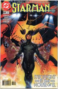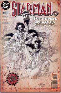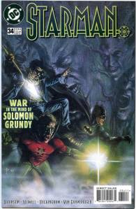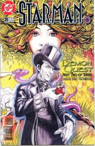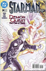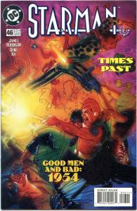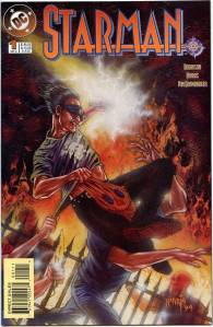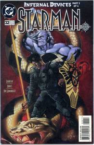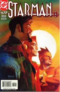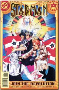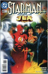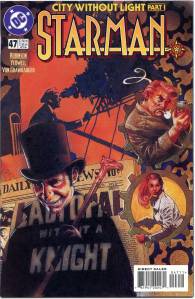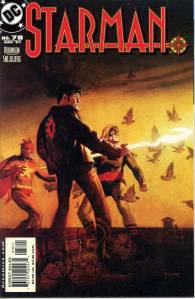 In Zero Hour: Crisis in Time #1 (September 1994), writer James Robinson and artist Tony Harris introduced Jack Knight, the son of the first Starman. He wields a cosmically-powered staff, but refuses to wear a costume, instead preferring a T-shirt, leather jacket (with star emblem on the back), a Cracker Jack prize sheriff’s star,and light-shielding tank goggles. Jack briefly joined the JSA, but soon retired at the end of the Starman series, passing along his cosmic rod to the JSA’s young heroine, Stargirl. He starred in this critically acclaimed series from 1994 until 2001.