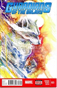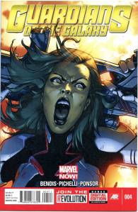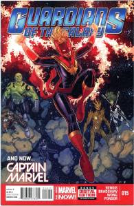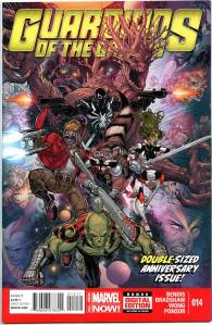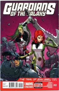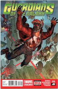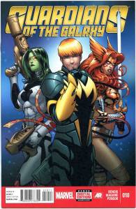After Star-Lord’s father visits him in a bar to tell him that it is forbidden for any alien species to visit Earth, Iron Man is attacked by Badoon appearing to attack Earth. The Guardians and their newest member Iron Man defeat the ship; however, London is still attacked. The Guardians defend London and finish off the horde of Badoon but learn that, for violating the “Earth-is-off-limits” rule (the Spartax Earth Directive), they are to be placed under arrest by the King of Spartax. The Guardians manage to escape with the help of Groot, who had recently regrown after being destroyed by a Badoon ship’s explosion. The team includes Star-Lord, Drax the Destroyer, Gamora, Groot, Rocket Raccoon, and Tony Stark. In April 2013, it was announced that Image Comics’ Angela (Spawn) would join the Marvel Universe as the result of a legal battle between Neil Gaiman and Todd McFarlane. After appearing in Age of Ultron, she joined the Guardians. Captain Marvel and Agent Venom have also joined .