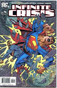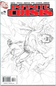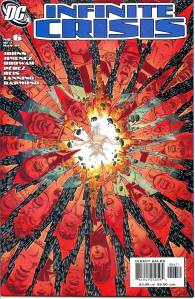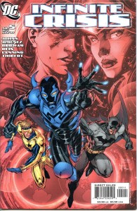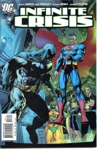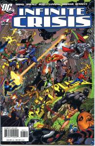 “Infinite Crisis” is a 2005–2006 comic book storyline published by DC Comics, consisting of an eponymous, seven-issue comic book limited series written by Geoff Johns and illustrated by Phil Jimenez, George Pérez, Ivan Reis, and Jerry Ordway, and a number of tie-in books. The main miniseries debuted in October 2005, and each issue was released with two variant covers: one by Pérez, and one by Jim Lee and Sandra Hope.