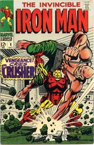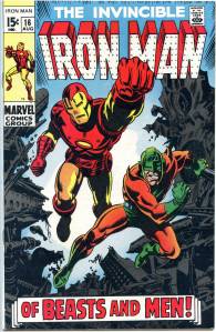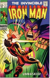 After issue #99 (March 1968), the Tales of Suspense series was renamed Captain America. An Iron Man story appeared in the one-shot comic Iron Man and Sub-Mariner (April 1968), before the “Golden Avenger”] made his solo debut with The Invincible Iron Man #1 (May 1968). The series’ indicia gives its copyright title Iron Man, while the trademarked cover logo of most issues is The Invincible Iron Man. Artist George Tuska began a decade long association with the character with Iron Man #5 (Sept. 1968). Writer Mike Friedrich and artist Jim Starlin‘s brief collaboration on the Iron Man series introduced Mentor, Starfox, and Thanos in issue #55 (Feb. 1973). Friedrich scripted a metafictional story in which Iron Man visited the San Diego Comic Convention and met several Marvel Comics writers and artists. He then wrote the multi-issue “War of the Super-Villains” storyline which ran through 1975.