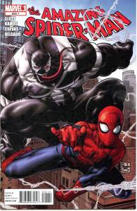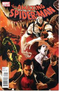 Mark Waid scripted the opening of “The Gauntlet” storyline in issue No. 612. The Gauntlet story was concluded by Grim Hunt (No. 634-637) which saw the resurrection of long-dead Spider-Man villain, Kraven the Hunter. The series became a twice-monthly title with Dan Slott as sole writer at issue No. 648, launching the Big Time storyline. Eight additional pages were added per issue. Big Time saw major changes in Spider-Man/Peter Parker’s life, Peter would start working at Horizon Labs and begin a relationship with Carlie Cooper (his first serious relationship since his marriage to Mary Jane), Mac Gargan returned as Scorpion after spending the past few years as Venom, Phil Urich would take up the mantle of Hobgoblin, and the death of J. Jonah Jameson’s wife, Marla Jameson. Issues 654 and 654.1 saw the birth of Agent Venom, Flash Thompson bonded with the Venom symbiote, which would lead to Venom getting his own series Venom (volume 2). Starting in No. 659 and going to No. 655, the series built-up to the Spider-Island event which officially started in No. 666 and ended in No. 673. Ends of the Earth was the next event that ran from No. 682 through No. 687. This publishing format lasted until issue No. 700, which concluded the “Dying Wish” storyline, in which Parker and Doctor Octopus swapped bodies, and the latter taking on the mantle of Spider-Man when Parker apparently died in Doctor Octopus’ body. The Amazing Spider-Man ended with this issue, with the story continuing in the new series The Superior Spider-Man.] Despite The Superior Spider-Man being considered a different series to The Amazing Spider-Man, the first 33 issue run goes towards the legacy numbering of The Amazing Spider-Man acting as issues 701-733. In December 2013, the series returned for five issues, numbered 700.1 through 700.5, with the first two written by David Morrell and drawn by Klaus Janson.