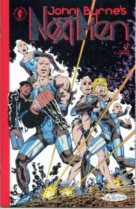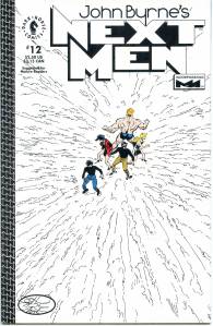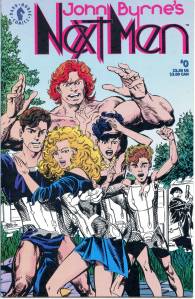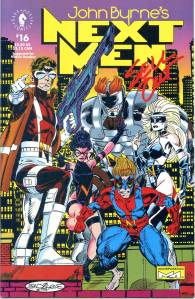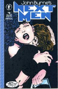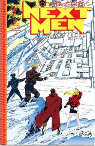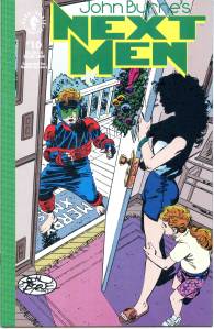 The Next Men characters made a prototypical appearance as “Freaks” in a lithography plate that was published within the History of the DC Universe Portfolio in 1986. Byrne had originally pitched the series to DC Comics, but the series never surfaced there. With some changes, Byrne changed the concept to fit in with his work on the graphic novel 2112, to become the John Byrne’s Next Men series. Two characters from the “Freaks” artwork somewhat retained their physical looks and became the lead characters of the Next Men series: heroine Jasmine and villain Aldus Hilltop.