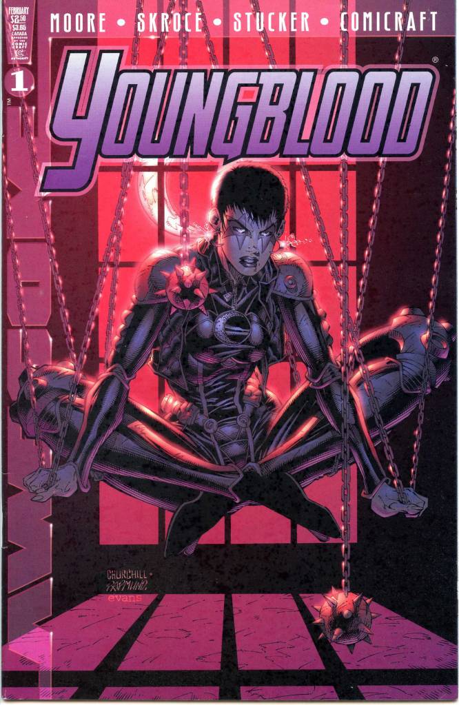 Moore created a new, teenaged Youngblood group that was financed independently by millionaire Waxey Doyle, formerly the WWII superhero Waxman. The team was led by Shaft and was augmented by new members Big Brother, Doc Rocket, Twilight, Suprema, and Johnny Panic. Moore said he wanted Youngblood to be a “less sprawling, more dynamic team” and that “if you have more characters than [six], the action gets cluttered and it becomes increasingly difficult to establish each character as a real and solid person in their own right”. All of the new team members and most of the villains featured in this series, including Jack-A-Dandy, were Moore’s creations.