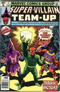 Issue #14 (Oct. 1977), which featured Magneto and Dr. Doom, was billed as the final issue of the series, and its plotline was resolved in The Champions #16. The following year, SVTU continued with issue #15 (Nov. 1978), a reprint of Astonishing Tales #4-5. Issues #16 (May 1979) and #17 (June 1980) featured the Red Skull and the Hate-Monger. The irregular publishing frequency of the final three issues was due to a legal maneuver to prevent DC Comics from trademarking the term “super-villain”.