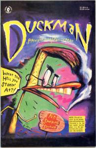 Story and art by Everett Peck. He’s been up–he’s been down–he’s fallen asleep with the TV on! New, hot from this previous engagement in Dark Horse Presents, the tough duck private dick, stars in his first feature length special. The story wouldn’t be complete without Cornfed, Fluffy, and Uranus hanging around waiting for the next dose of abuse from their feathered “friend.”