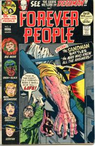 The Forever People lasted eleven issues. They mainly fought Darkseid’s forces such as Glorious Godfrey in issue #3. Issues #9 and 10 guest-starred Deadman; according to writer/artist Jack Kirby‘s assistant Mark Evanier, “We were ordered to put Deadman into New Gods, but we slipped him into Forever People instead, where he was a little less obtrusive. Jack didn’t like the character and didn’t want to do it. He didn’t feel he should be doing someone else’s character. … He doesn’t want to trample on someone else’s vision. Carmine [Infantino, DC Comics publisher and Deadman’s co-creator] said the character hadn’t sold and he wanted the Kirby touch on it.”