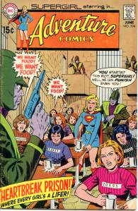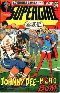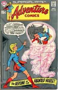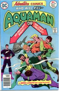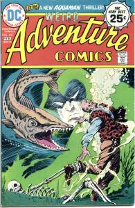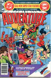 In the late 70’s conventional superheroes returned to the book, beginning behind the Spectre, first a three-issue run of Aquaman (issues #435–437, an early assignment for Mike Grell) and then a newly drawn 1940s Seven Soldiers of Victory script (issues #438–443). Aquaman was promoted to lead (issues #441–452), and backing him up were three-part story arcs featuring the Creeper (#445–447), the Martian Manhunter (#449–451), bracketed by issue-length Aquaman leads. He was awarded his own title and Superboy (#453–458) took over Adventure with Aqualad (#453–455) and Eclipso (#457–458) backups. Following this was a run as a Dollar Comic format giant-sized book (issues #459–466), including such features as the resolution of Return of the New Gods (cancelled in July–August 1978), “Deadman“, and the “Justice Society of America“.