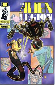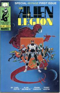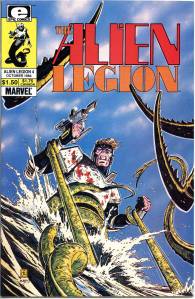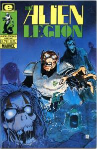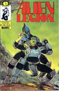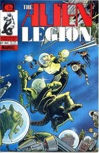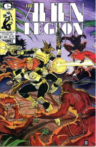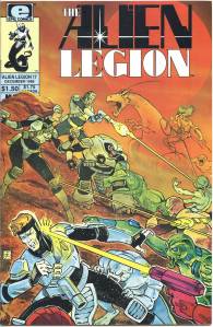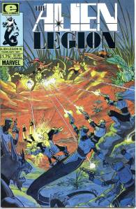 The franchise debuted with Marvel/Epic Comics’ The Alien Legion #1-20 (cover-dated April 1984 – June 1987). The 18-issue Alien Legion (Oct. 1987 – Aug. 1990), minus the “The”, followed, generally scripted by Chuck Dixon and penciled by Larry Stroman. Afterward came the three-issue Dixon-Stroman miniseries Alien Legion: On The Edge (Nov. 1990 – Jan. 1991); the two-issue Dixon-Stroman Alien Legion: Tenants of Hell (1991); the one-shot cover-titled Alien Legion: Grimrod and copyrighted Alien Legion: Jugger Grimrod (Aug. 1992), by Dixon and artist Mike McMahon; the single-issue Alien Legion: Binary Deep (Sept. 1993), by Dixon and Argentine artist Enrique Alcatena; and the three-issue miniseries Alien Legion: One Planet at a Time (April–July 1993), by Dixon and penciler Hoang Nguyen.