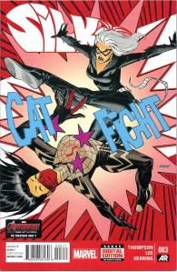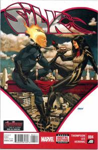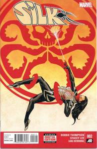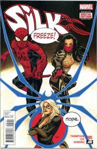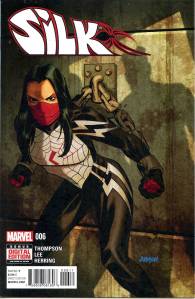 Silk first appeared in The Amazing Spider-Man #1 (April 2014) as a faceless cameo and was created by writer Dan Slott and artist Humberto Ramos. She made several other faceless appearances throughout the volume’s first story arc, before making her full debut in The Amazing Spider-Man #4 (July 2014), as part of a tie-in to the “Original Sin” storyline. An ongoing title featuring Silk started publishing in February 2015, with scripts by Supernatural writer Robbie Thompson and art by Stacey Lee. Silk volume 1 came to an end during the Secret Wars event. After the event, a second volume began which concluded on issue #19.