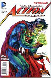As with all of the books associated with the DC relaunch, Clark Kent appears to be about five years younger than the previous incarnation of the character (where it would focus on the early days of Superman’s career, whereas the main series would focus on the present). Superheroes at large have appeared only in the past five years, and are viewed with at best, suspicion, and at worst, outright hostility. The storyline in Action Comics takes place about a year before the events of Justice League #1, and was referred to by DC Co-Publisher Dan DiDio as “DC Universe Year Zero” while JL operates as “Year One.” The Man of Steel is not yet trusted by the citizens of Metropolis and wears a basic costume consisting of a caped T-shirt, jeans and work boots.