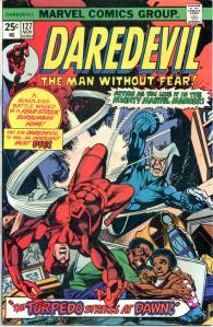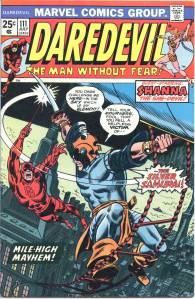 Gerry Conway took over as writer with issue #72, and turned the series in a pulp science fiction direction: a lengthy story arc centered on a robot from thousands of years in the future trying to change history. Even long-standing arch-villain the Owl was outfitted with futuristic weaponry and vehicles. Conway also moved Daredevil to San Francisco beginning with Daredevil #86, and simultaneously brought on the Black Widow as a co-star for the series. The Black Widow served as Daredevil’s crime-fighting ally as well as his love interest from issue #81–124 (Nov. 1971–Aug. 1975), of which #93-108 were titled Daredevil and the Black Widow.