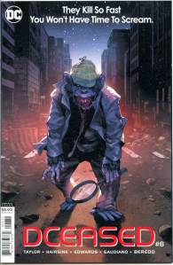 DCeased is a six-issue comic book miniseries published by DC Comics from May to October 2019. It was created by writer Tom Taylor and the artistic team including penciler Trevor Hairsine and inker Stefano Guadiano. The story takes place in an alternate Earth, where a corrupted version of the Anti-Life Equation has infected most of Earth’s inhabitants with a zombie-like virus. Lois Lane acts as the series’ narrator, detailing how the events took place over the course of a few weeks.