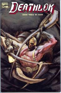 The final feature in Astonishing Tales starred and introduced Deathlok, a conflicted cyborg who predated the popular movie character RoboCop by several years and has become one of the most enduring Marvel characters among those introduced in the 1970s; at least two major iterations of the character, featuring different individuals, starred in series in the 1990s and 2000s. Created by artist Rich Buckler, who devised the initial concept, and writer Doug Moench, the feature ran from #25-28 and 30-36 (Aug. 1974 – Feb. 1975 and June 1975 – July 1976), the final issue. Bill Mantlo scripted issues #32-35, with Buckler himself scripting the finale. Buckler described Deathlok as “an extension of a paranoid fantasy. He was a representation of part of my outlook and world view. He was a culmination of many of the messages in some of the music of the time. He was part of some of the things going wrong in our country at the time. Maybe he was the science that was going wrong.Artist George Pérez made his professional comics debut with a two-page backup feature in issue #25.