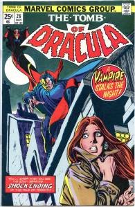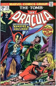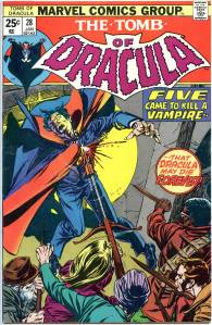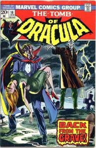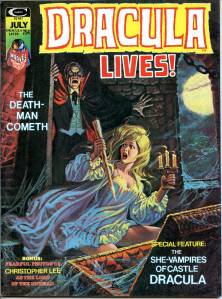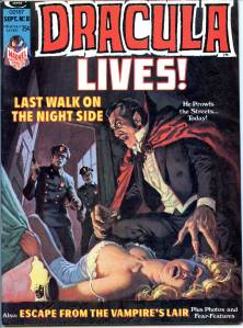 The magazine format did not fall under the purview of the Comics Code, allowing the title to feature stronger content — such as moderate profanity, partial nudity, and more graphic violence — than Marvel’s “mainstream” titles. The larger format allowed the interior artists to “stretch out” a bit more. Painted covers of the series were done by artists like Boris Vallejo, Neal Adams, and Luis Dominguez. Dracula Lives!‘ text and photo articles were mostly of the Count’s various film appearances. The title of the magazine’s letter column was “Dracula Reads!”