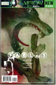 Fables was a series published by DC Comics‘s Vertigo imprint beginning in 2002. The series deals with various people from fairy tales and folklore – referring to themselves as “Fables” – who have been forced out of their Homelands by “The Adversary” who has conquered the realm. The Fables have traveled to our world and formed a clandestine community in New York City known as Fabletown. Fables who are unable to blend in with human society (such as monsters and anthropomorphic animals) live at “the Farm” in upstate New York.