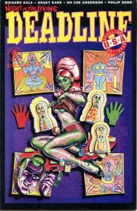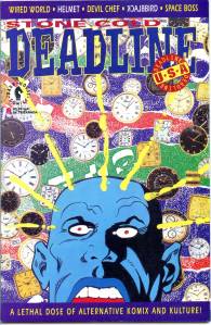You’ve seen him on MTVs Liquid Television–Richard Sala continues his all-new, ultraterrifying 13 O’clock! He’s harder than hard-boiled, he’s Johnny Nemo by the ultrascientific Peter Milligan and Brett Ewins! It’s sex, it’s rock n’ roll, but is it drugs? It’s Doe, the latest graphic vortex from Harvey Award ultranominee Ho Che Anderson! They play the game, God makes the rules! They’re the A-Men by the ultraconservative Shaky Kane! Plus work by Julie Hollings, Philip Bond, Alec Stevens, D’Israeli and never forget GWAR, puny human! And an ultraspecial music feature! And another ultraschizophrenic cover painting from the corkscrewed psyche of Mitch O’Connell!