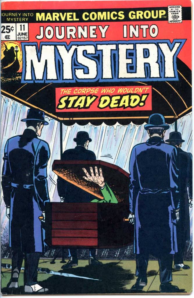 The first five issues of Journey into Mystery vol. 2 featured such adaptations as Robert E. Howard‘s “Dig Me No Grave”, by writer Thomas and pencilerGil Kane, in issue #1; Robert Bloch‘s “Yours Truly, Jack the Ripper” by Thomas and Ron Goulart and penciler Kane, in #2; and H. P. Lovecraft‘s “The Haunter of the Dark” by Goulart and penciler Gene Colan, in addition to anthological horror stories by writers including George Alec Effinger, Steve Gerber, Steve Englehart, and Steve Skeates, and pencilers such as Billy Graham, Jim Starlin, Ralph Reese, and P. Craig Russell. Most issues also included a reprinted story from Marvel’s 1950s predecessor, Atlas Comics. By issue #6, however, the magazine became a reprint title featuring science-fiction and giant-monster tales from the first Journey into Mystery series, as well as from the “pre-superhero Marvel” anthologies Amazing Adult Fantasy, Strange Tales, Strange Worlds, and Tales to Astonish.