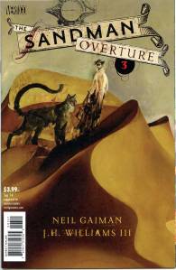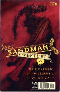 To commemorate the twenty-fifth anniversary of The Sandman, Gaiman wrote a new tale involving the battle that had exhausted Morpheus prior to the beginning of the original story. Written by Gaiman and with art by J. H. Williams III, Overture tells the previously hinted story of Dream’s adventure prior to Preludes and Nocturnes, which had exhausted him so much that it made Burgess’ actions capable of capturing him. The limited series had six issues. Issue #1 was released on October 30, 2013, and although it was planned to have a bi-monthly release schedule, issue 2 was delayed until March 2014, which Gaiman explained was “mostly due to the giant signing tour I was on from June, and me not getting script written on the tour, with knock-on effects”. Special editions were released approximately a month after the original editions, which contain interviews with the creative team, alongside rare artwork.