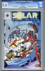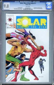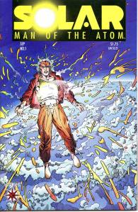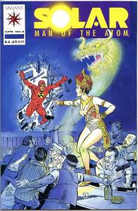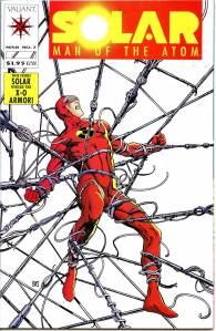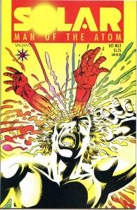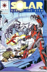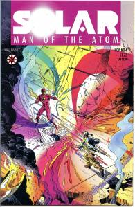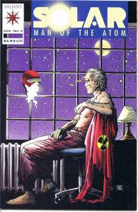 Valiant’s Solar, Man of the Atom began with three multi-part stories all written by Jim Shooter: “Alpha and Omega” with artwork by Barry Windsor-Smith and Bob Layton, spanned the first ten issues and told of the origin story of how the protagonist, Phil Seleski, became Solar, until the time he accidentally destroys the world; “Second Death”, with artwork by Don Perlin, Bob Layton and Thomas Ryder, spanned the first four issues and tells of Seleski’s attempt to prevent another version of himself from destroying the world; “First Strike”, with artwork by Don Perlin and Stan Drake, spanned issues #5 to #8 and follows Solar as he fights spider aliens. These first year stories included first appearances by Eternal Warrior, the Harbinger Foundation, Geomancers, and the X-O Manowar armor – all of which would be spun off into their own series.