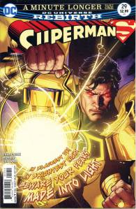 Beginning an all-new monthly Superman title. Over a year ago, Superman fought the urge to become the Krypton Man…now the Krypton Man is born anew from the Earth’s fiery sun, where the Man of Steel buried the mysterious Kryptonian Eradicator! In the wake of the rebirth of his nemesis, Earth’s yellow sun begins turning red – causing natural disasters planetwide!
