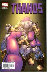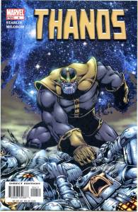 In 2004 Thanos received an eponymous title that ran for 12 issues. After defeating the Hunger, Thanos went to the frontline and gave himself up to the Omega Corps. After a panicked action from the corps they send him to the Kyln. On his way he killed a Skrull agent to give them a reason to imprisoned him. On Kyln, a priest told him about the prison while Thanos is watching the Crunch. When the Priest left, Death appeared and talked to him, telling him She loves him in her way, and that he hadn’t given her anything that she didn’t already have.