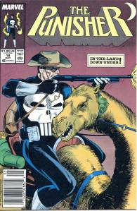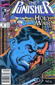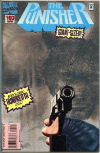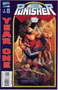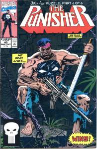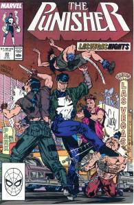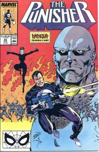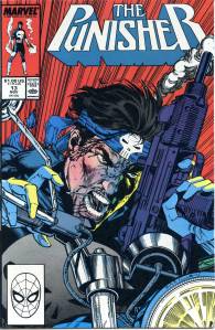 The Punisher ongoing series premiered in 1987. Initially by writer Mike Baron and artist Klaus Janson, it eventually ran 104 issues (July 1987 – July 1995) and spun off two additional ongoing series — The Punisher War Journal (80 issues, November 1988 – July 1995) and The Punisher War Zone (41 issues, March 1992 – July 1995), as well as the black-and-white comics magazine The Punisher Magazine(16 issues, November 1989 – September 1990) and The Punisher Armory (10 issues, no cover dates, starting 1990), a fictional diary detailing “His thoughts! His feelings! His weapons!” (as stated on the cover of issue #1). The Punisher also appeared in numerous one-shots and miniseries, and made frequent guest appearances in other Marvel comics, ranging from superhero series to the Vietnam War-era comic The ‘Nam.