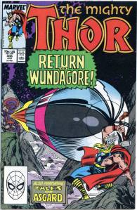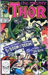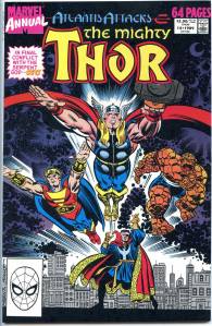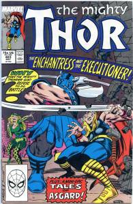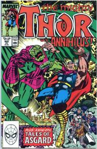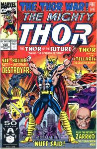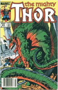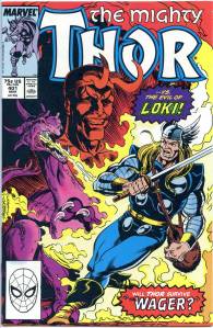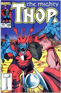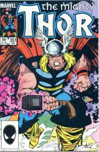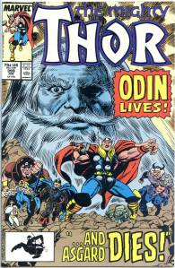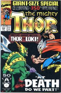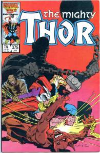 Walt Simonson took over both writing and art as of #337 (Nov. 1983). His stories placed a greater emphasis on the character’s mythological origins. Simonson’s run as writer-artist lasted until #367 (May 1986), although he continued to write – and occasionally draw – the book until issue #382 (Aug. 1987). Simonson’s run, which introduced the character Beta Ray Bill, was regarded as a popular and critical success. Simonson’s later stories were drawn by Sal Buscema, who describes Simonson’s stories as “very stimulating. It was a pleasure working on his plots, because they were a lot of fun to illustrate. He had a lot of great ideas, and he took Thor in a totally new direction.” Asked why he was leaving Thor, Simonson said that he felt the series was due for a change in creative direction, and that he wanted to reduce his work load for a time. After Simonson’s departure, Marvel’s editor-in-chief at the time, Tom DeFalco, became the writer. Working primarily with artist Ron Frenz, DeFalco stayed on the book until #459 (Feb. 1993).