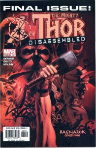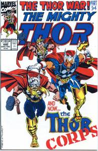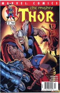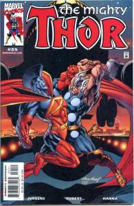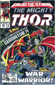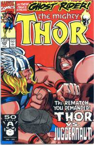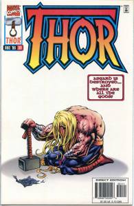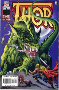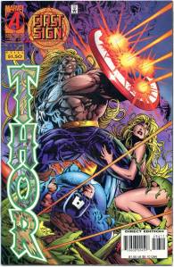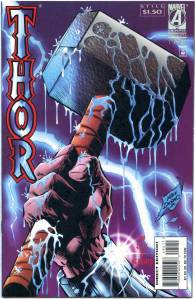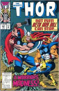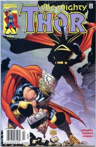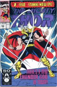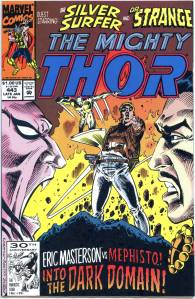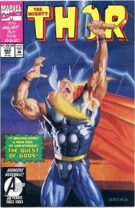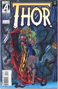 After Simonson’s departure, Marvel’s editor-in-chief at the time, Tom DeFalco, became the writer. Working primarily with artist Ron Frenz, DeFalco stayed on the book until #459 (Feb. 1993). As a consequence of the “Heroes Reborn” crossover story arc of the 1990s, Thor was removed from mainstream Marvel continuity and with other Marvel characters re-imagined in an alternate universe for one year. The Thor title reverted to Journey into Mystery with issue #503 (Nov. 1996), and ran four different, sequential features (“The Lost Gods”; “Master of Kung Fu“; “Black Widow“, and “Hannibal King“) before ceasing publication with #521 (June 1998).