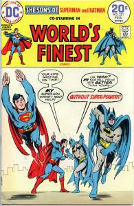 World’s Finest featured Superman and Batman team-ups until issue #197. Noted Batman artist Neal Adams first drew the character in an interior story in “The Superman-Batman Revenge Squads” in issue #175 (May 1968). The title briefly featured Superman teaming with heroes other than Batman in the early 1970s beginning with issue #198 (November 1970). That issue featured the first part of a two-issue team-up with the Flash. The series reverted to Superman and Batman team-ups after issue #214, initially with a unique twist, featuring the children they might one day have, Superman Jr. and Batman Jr. These characters, billed as the Super-Sons, were co-created by writer Bob Haney and artist Dick Dillin in issue #215 (January 1973).
